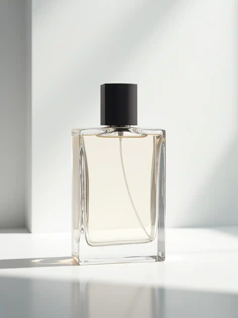 Maqueta de producto profesional en una superficie blanca limpia. Botella de perfume de vidrio premium, diseño minimalista. Sombras naturales suaves, configuración de iluminación de estudio con reflexión sutil. Vista de ángulo lateral con enfoque nítido. La etiqueta del producto es clara y legible. Antecedentes: blanco puro. Clasificación de color profesional, estilo de fotografía comercial, resolución 8K