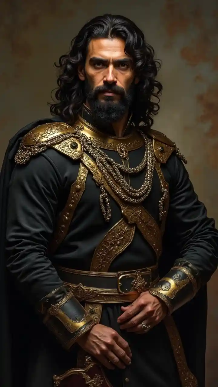 Un retrato de obra maestra de William Adolphe Bouquereau de un soldado persa que vestía un vestido masculino persa detallado en negro y oro, cabello largo y negro rizado, ojos marrones, barba completa, masa muscular alta