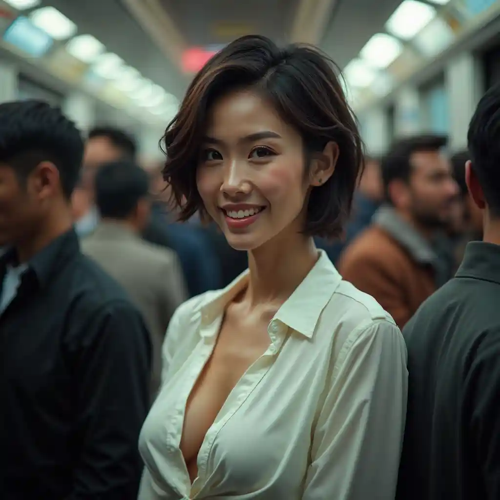 fotorrealista, alto contraste, 8k HD, detallado, hiperdetallado, mejor calidad, ultra alta resolución, foto en bruto, iluminación dramática, motor irreal, una joven sonriente muy hermosa con cabello corto, en el metro, gente abarrotada, un gran pecho, vistiendo camisas blancas