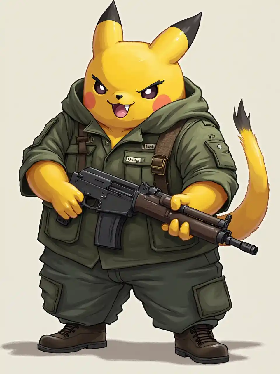 Emerypifatchu el hermano gordo enojado de pikatchu con colmillos y garras usa ropa militar y sostiene un AK