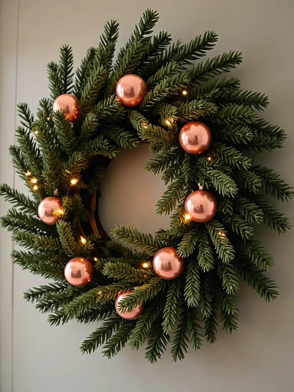 Corona de Navidad de pino con bolas y luces navideñas