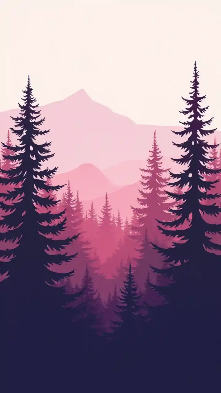 "Silueta de pinos con la misma disposición y composición que la imagen original. Reemplace la paleta de colores con tonos suaves y armoniosos sin magenta. El fondo debe cambiar a un degradado sutil que complemente los nuevos colores, manteniendo una estética limpia y minimalista.