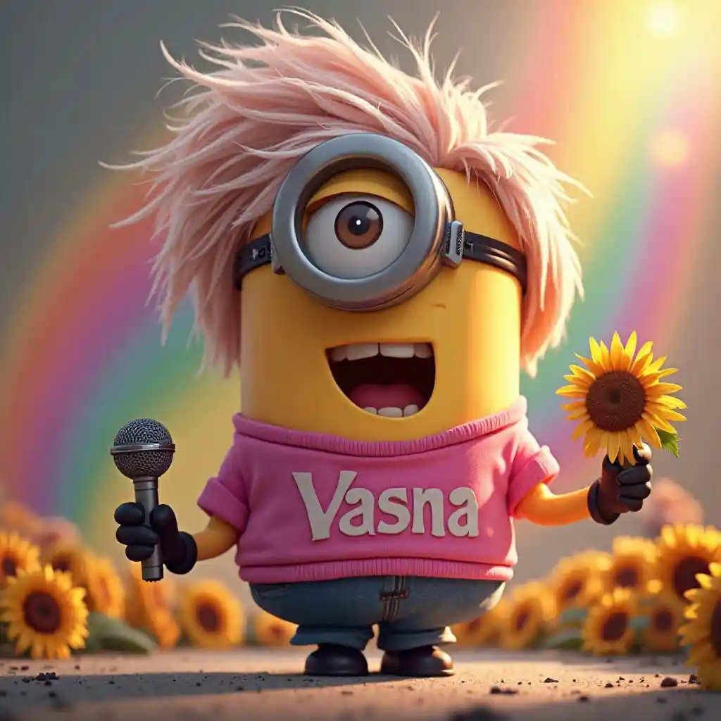 Un esbirro femenino, con una camisa rosa que dice "Yasna", cantando, Tiene un girasol en una mano y un micrófono en la otra, junto a un arco iris con mucha luz, Obra maestra, 4k, 8k, altamente detallada, mirando al espectador, yo despreciable, un ojo, antropomórfico,