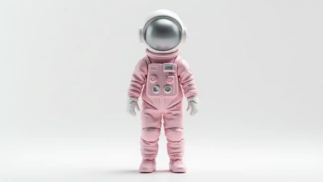 Aubreyastronauta, parado, traje espacial rosa, fondo blanco