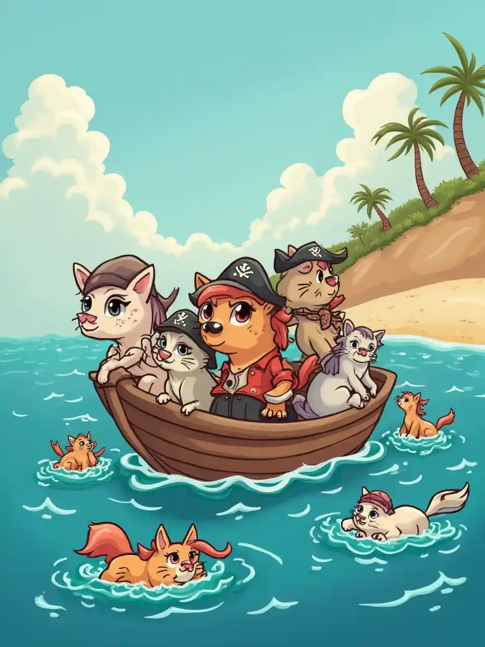 RoyIlustración de gatos y ponis piratas en un bote y nadando en el océano cerca de una playa.