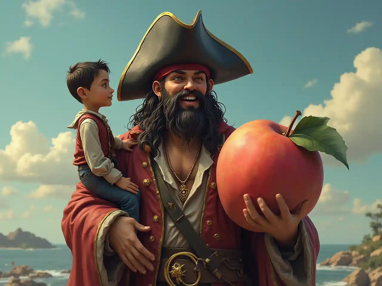 Pirata gigante sosteniendo a un hombre diminuto → Pirata sosteniendo un melocotón