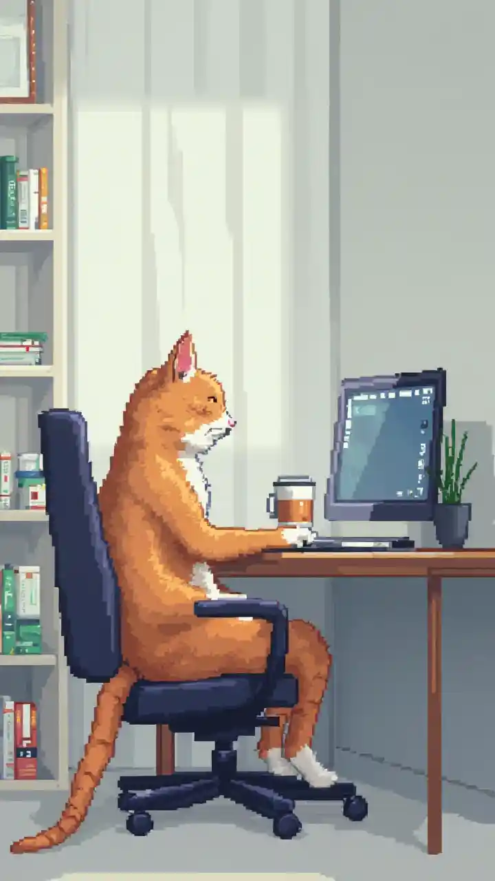 Ilustración de píxeles de 8 bits de un gato sentado en una silla solicitando trabajo en una computadora con café sobre la mesa (colores claros)