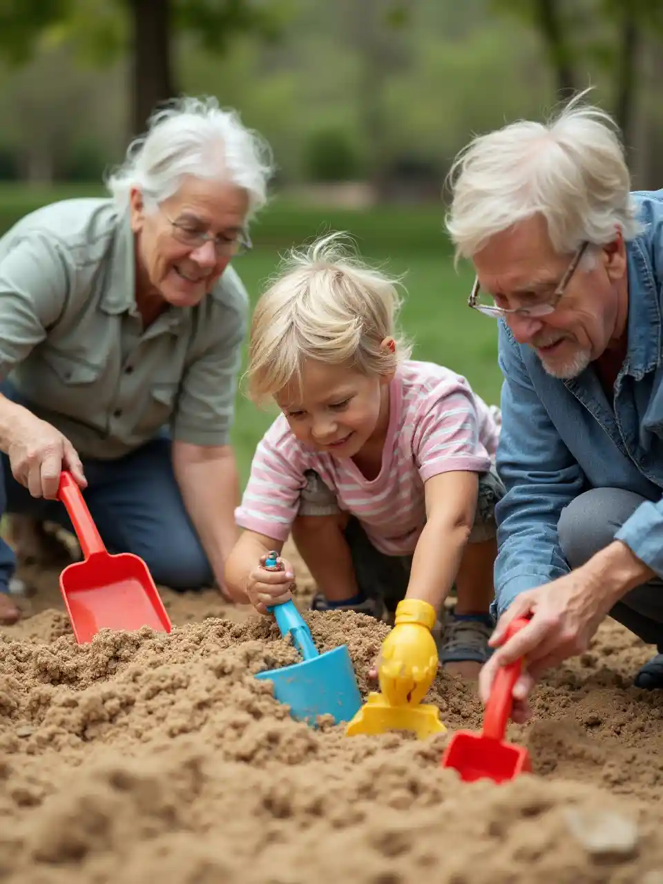 laaaaraTres ancianos jubilados con caras arrugadas, cavando como niños en una caja de arena. Equipado con juguetes de colores, palas y cubos. Todos vestidos como niños.