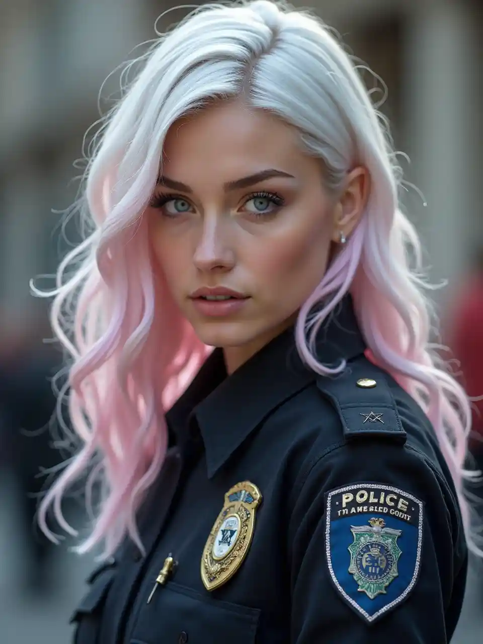 Una mujer policía con el pelo blanco y el pelo rosado