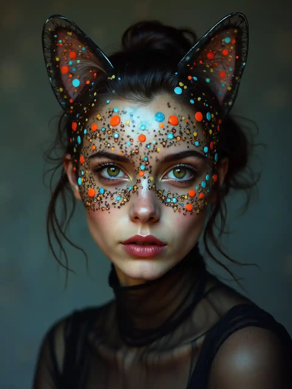 retrato frontal Fotografía, plexiglás oscuro transparente impreso con lunares, máscara de mujer gato, una atractiva vista de 80 grados, arte de Sergio López, Natalie Shau, James Jean y Salvador Dalí