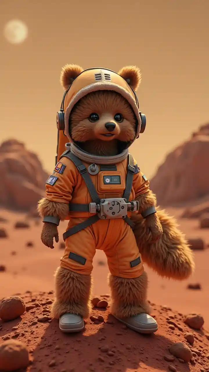MadelynUn caniche rizado como un mapache cohete de Guardianes de la Galaxia con disfraz de astronauta en Marte