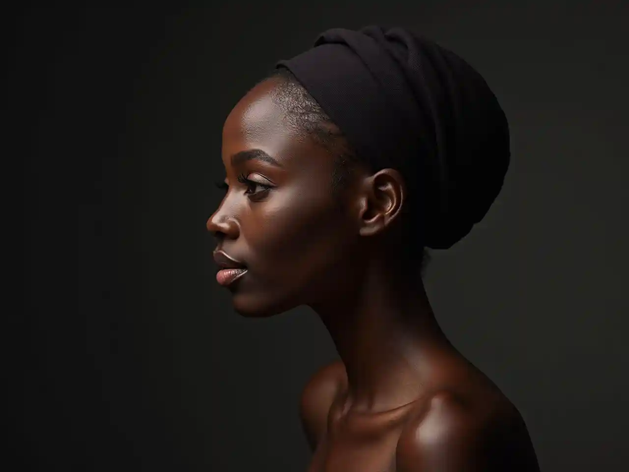 QinxueUn retrato de perfil lateral de una mujer negra, diadema, tono de piel oscuro vibrante, piel brillante, iluminación de estudio, fotografía ultra realista