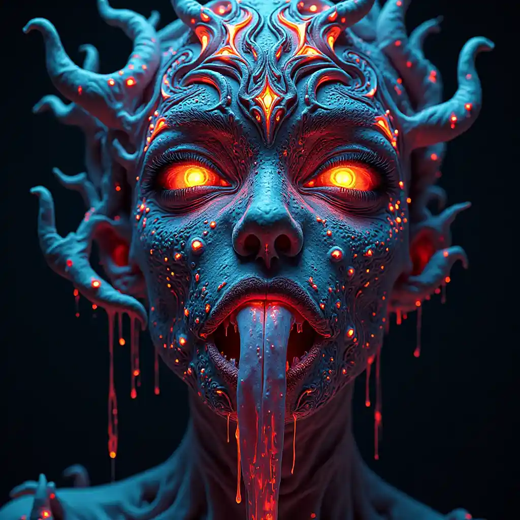 una entidad psicodélica de múltiples caras de mujeres hermosas con ojos fractales brillantes, dientes dorados afilados, una lengua espiral que gotea, texturas orgánicas caóticas, belleza de horror surrealista, paleta de arco iris de neón, patrones de capas complejas, remolinos caleidoscópicos, estilo de arte visionario, texturas ultra detalladas y fundidas, en el estilo de Android Jones y Alex Grey.fondo oscuro, efecto de luz negra, resplandor desde adentro, energía siniestra, formas líquidas, anatomía imposible, morfeo interdimensional, simetría alucinante
