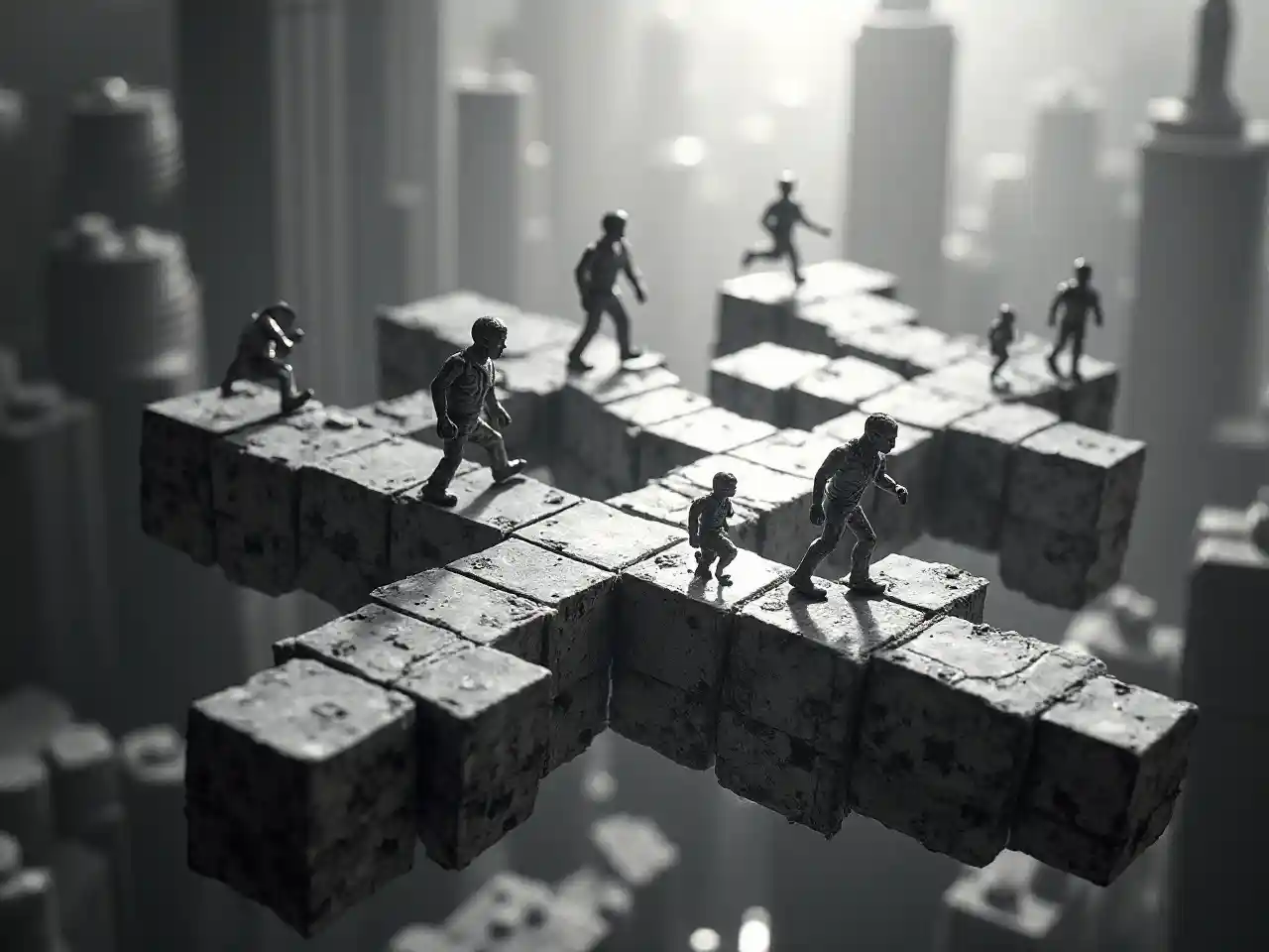 Puzzle de crucigramas en 3D suspendido en el caos, hiperrealista, jugadores corriendo en cuadrados de rompecabezas gigantes, atmósfera llena de acción, amenazantes bolígrafos de tinta y lápices colocados arriba, detalles intrincados del rompecabezas que conducen al peligro, composición dinámica, contrastes de luces y sombras llenos de tensión, blanco y negro, perspectiva dramática, experiencia inmersiva ultra detallada.