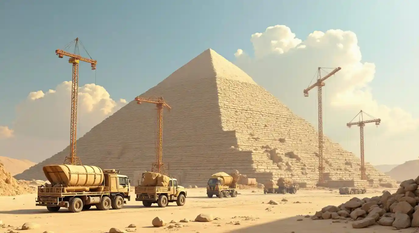 ruslanaUna antigua imagen egipcia de la construcción de la pirámide con muchas grúas grúas en la pirámide también. camiones traen bloques de piedra y piedra de superficie blanca