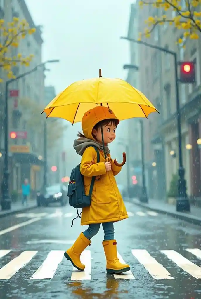 ilustración de libro ilustrado, A sostiene un paraguas amarillo y usa botas amarillas cruzando un cruce de peatones en un día lluvioso, imagen fácil