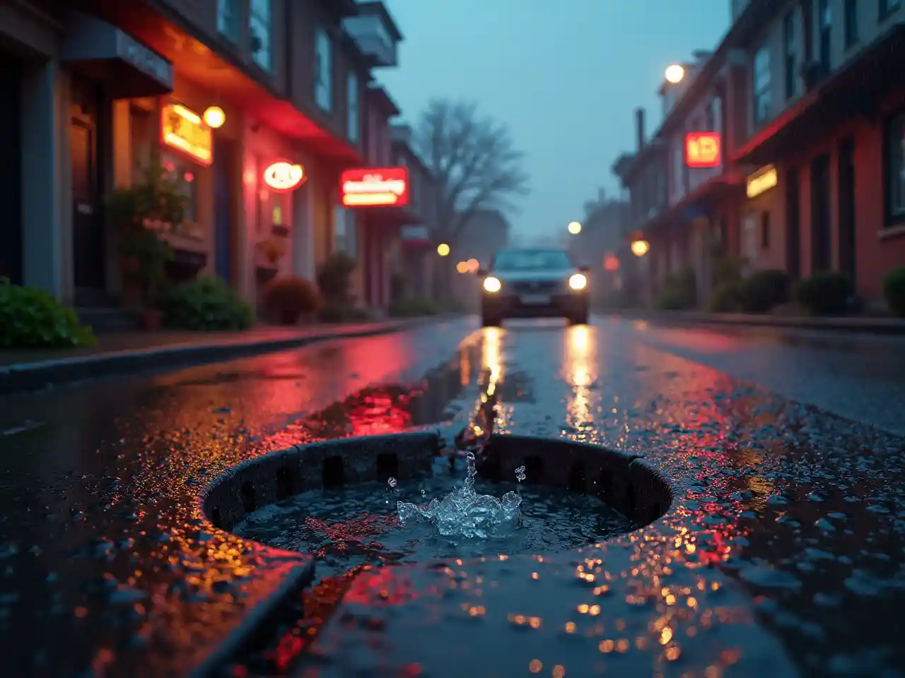 el agua de lluvia fluye hacia un viejo desagüe pluvial, las fuertes lluvias caen, los letreros de neón en las casas parpadean y brillan en diferentes colores, las salpicaduras de los charcos vuelan desde un automóvil que pasa, las gotas de lluvia a veces golpean la lente, la cámara cambia lentamente el enfoque de la carretera a los edificios y arriba
