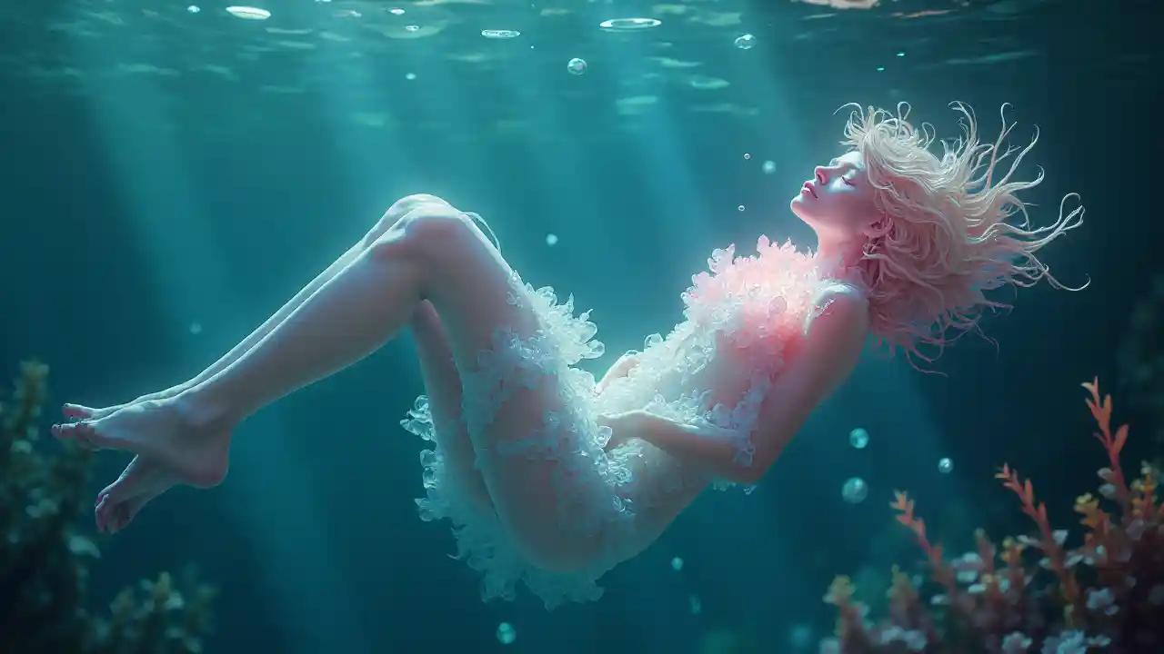 Una obra maestra de la pintura digital en el estilo surrealista de Ray Caesar. Una mujer brillante flota suavemente bajo el agua, sus branquias rosadas translúcidas florecen en sus mejillas como corales blandos. Su piel pálida brilla con reflejos sutiles, rodeada de plantas bioluminiscentes y burbujas a la deriva. Cada detalle brilla en una armonía acuática surrealista: sereno, delicado e inquietantemente hermoso.