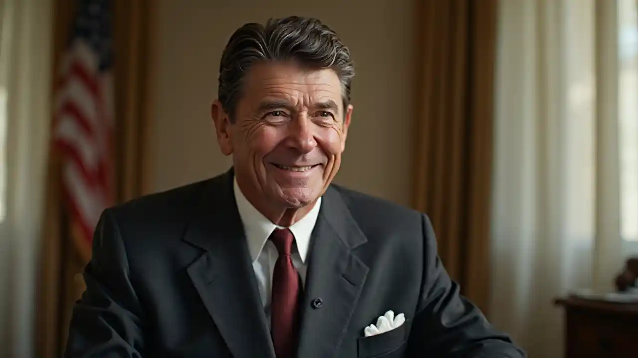 Retrato de Ronald Reagan en un traje gris oscuro, retrato en la oficina oval de la casa blanca, enfoque nítido, altamente detallado, fotorrealista fotorrealista: 1.4, realista, altamente detallado CG unificado 8K, mirando al espectador sonriendo, (HQ skin: 1.4), 8k uhd, dslr, iluminación suave, alta calidad, grano de película, Fujifilm XT3, cámara frontal sonriente.