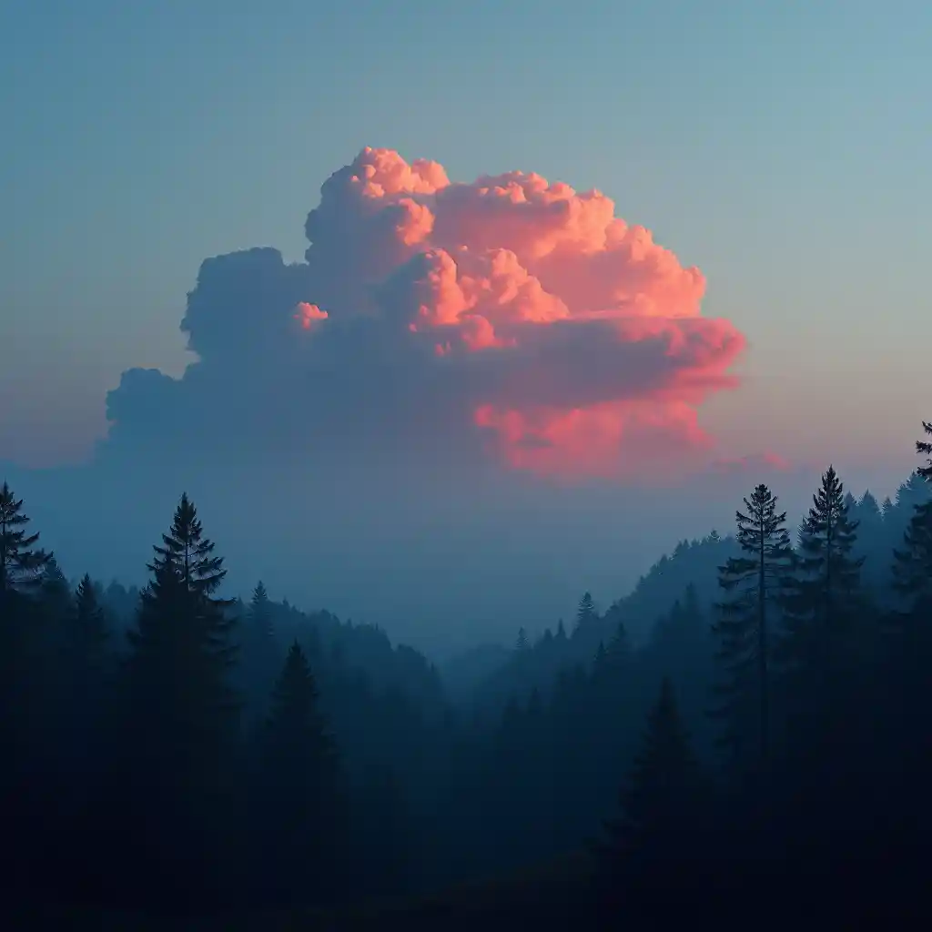 Una sola gran nube se cierne sobre un bosque oscuro y brilla con sutiles colores rojos, el aire está lleno de niebla, por lo que la luz brilla con colores azules muy brumosos y vibrantes, enfoque nítido y altamente detallado, iluminación dramática, profundidad de campo, increíblemente alto detallado, fotorrealista, en estilo de imagen analógica, refracciones de luz