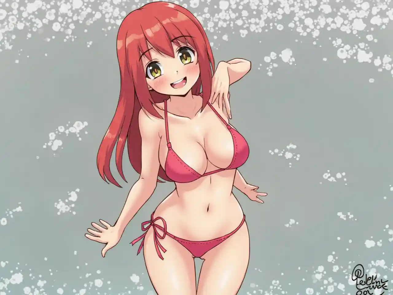 1 chica, cuerpo completo, cuerpo en forma, desde abajo, bikini de cuerdas, tetas perfectas, tanga de cuerdas, dedo de camello, cabello largo y rojo, sonriendo a través de los dientes, sonrojarse,