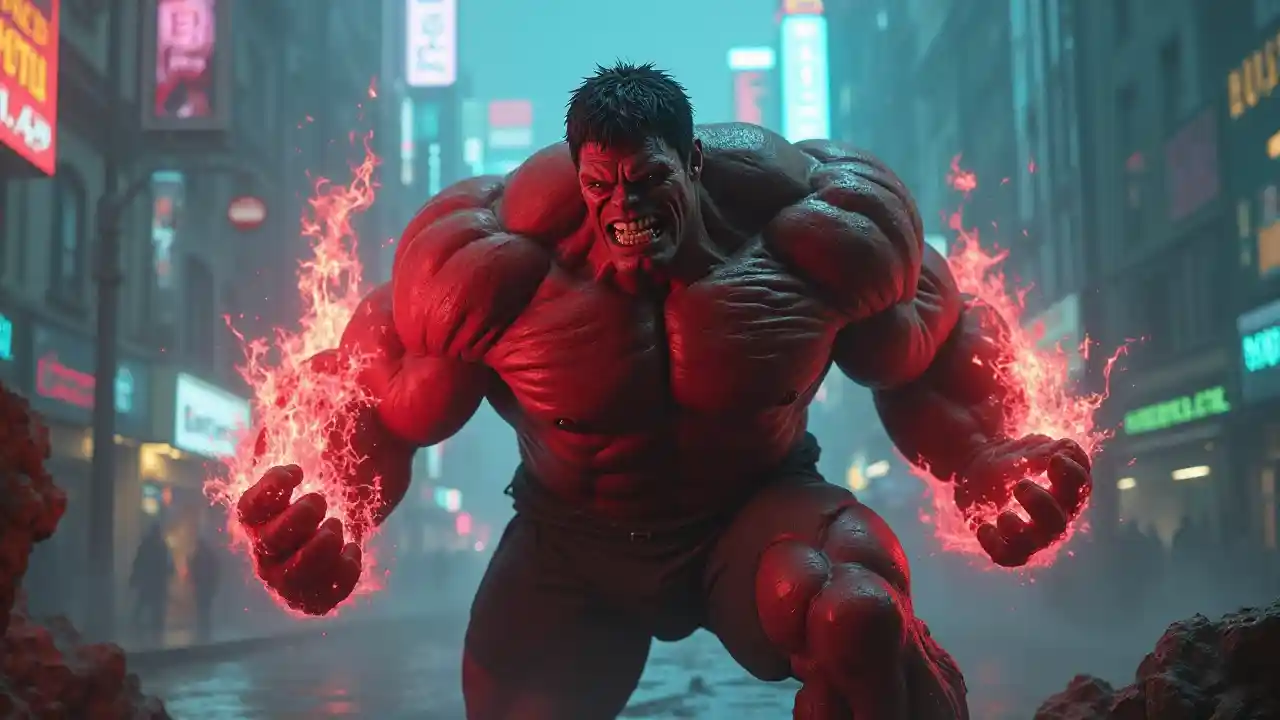 rubylyn10 pies de casco rojo agresivo con guantelete de piedras infinitas en la ciudad de neón con niebla
