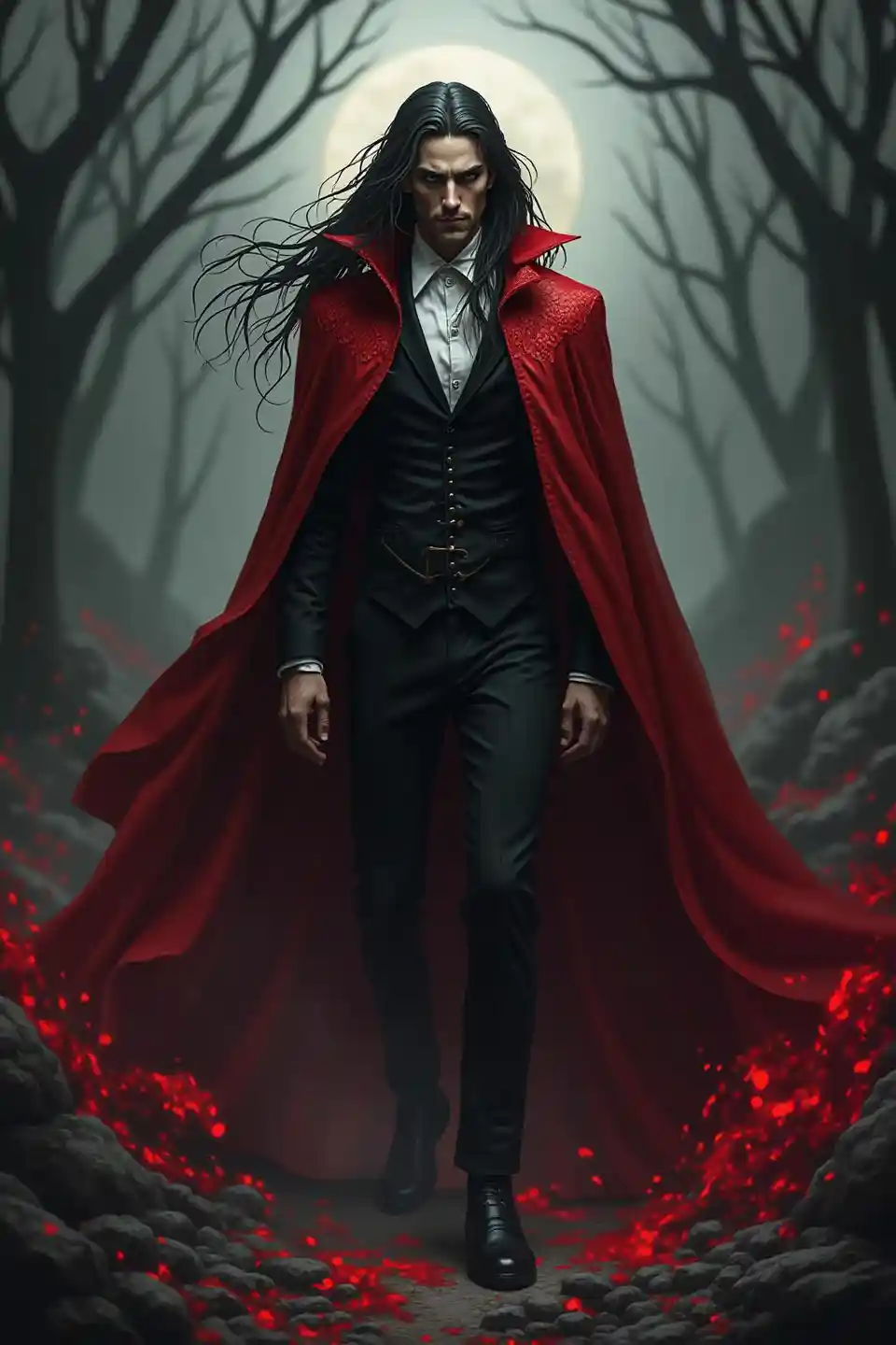 MwangVista frontal, un vampiro macho de pelo largo con un noble abrigo rojo sangre, de pie en un paisaje demoníaco arremolinado, su capa que fluye transformándose en sombras con gl