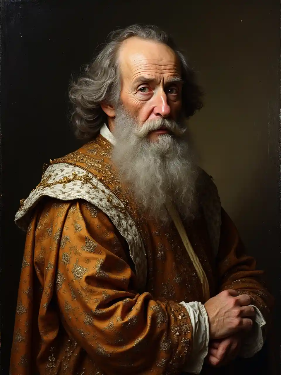 Una obra maestra de Rembrandt Van Rijn, un retrato más detallado de un anciano, detalles de barba intrincada, ropa extremadamente hermosa, oro, reflejos, composición de obra maestra, composición de proporción áurea, iluminación barroca