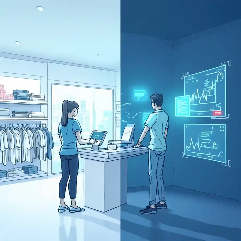 Cree una ilustración digital de un sistema moderno de gestión de inventario minorista en acción. Muestre una vista de pantalla dividida: en un lado, muestre un interior de tienda de ropa limpio y minimalista con exhibiciones de ropa plegada estilo Uniqlo y un cajero escaneando artículos en una terminal POS. Por otro lado, muestre un tablero digital con gráficos y cuadros de seguimiento de inventario en tiempo real que se actualizan a medida que se escanean los artículos. Incluya una notificación/alerta visual que aparezca tanto en la tableta del gerente de la tienda como en un monitor grande en un centro de distribución cuando los niveles de inventario de un artículo en particular (marcado en rojo) caigan por debajo del umbral. Use un esquema de color limpio y profesional con azules y blancos, e incorpore elementos digitales sutiles como flujos de datos que conectan la tienda con el sistema central. El estilo debe ser moderno, un poco futurista pero lo suficientemente realista como para comunicar claramente el concepto de seguimiento de inventario automatizado y generación de alertas en un entorno minorista ".