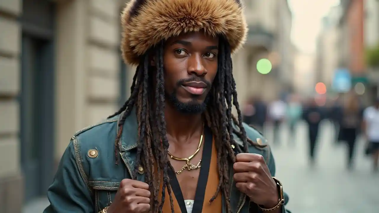 Foto de estilo callejero de una persona con un atuendo retro de streetwear con rastas y un sombrero peludo.
