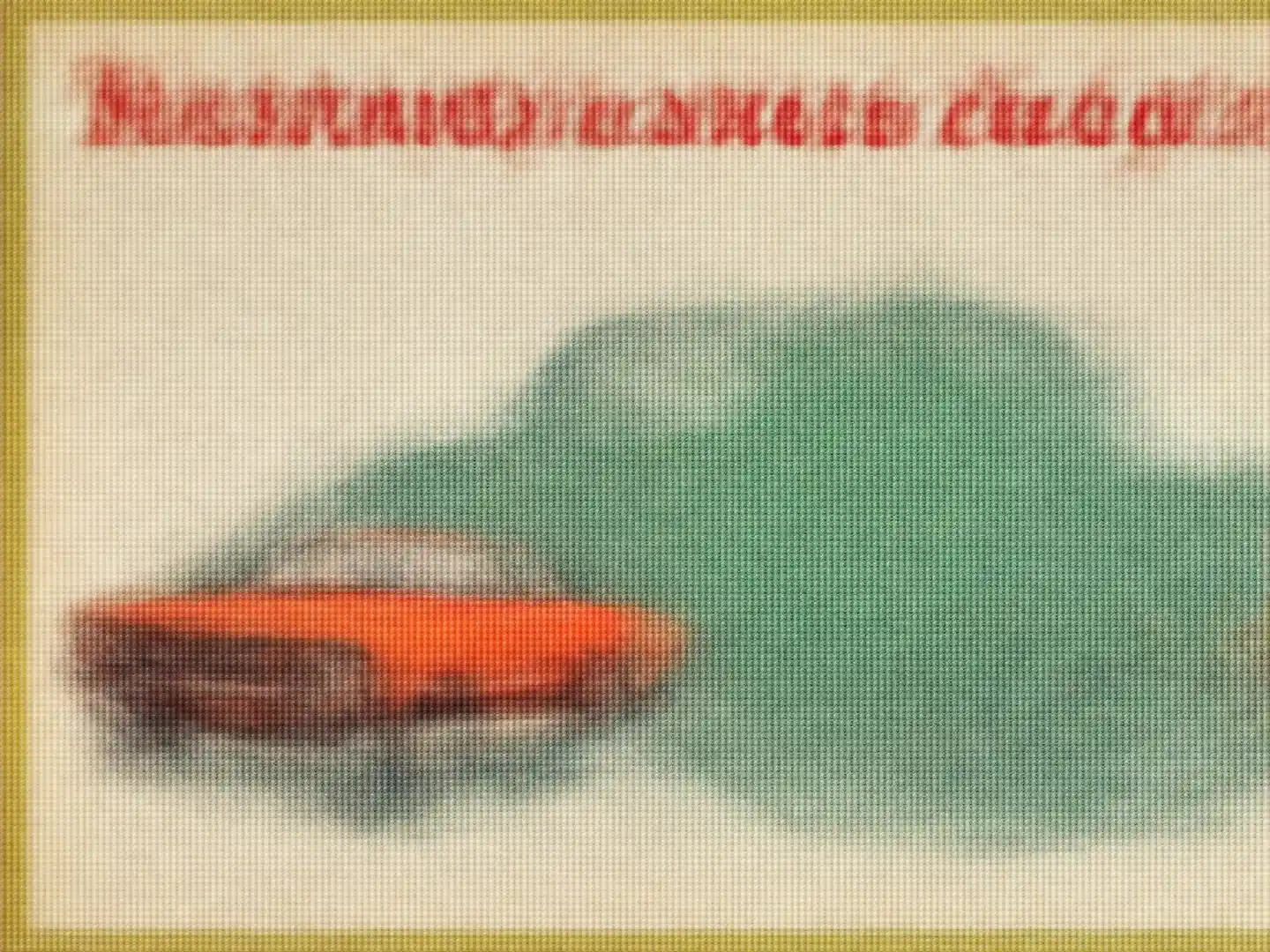 collage art, vintage, viejo mustang en estilo rojo anaranjado, auto sobrepuesto, ruedas giratorias, retro, surrealista, en fragmentos de papel verde y azul