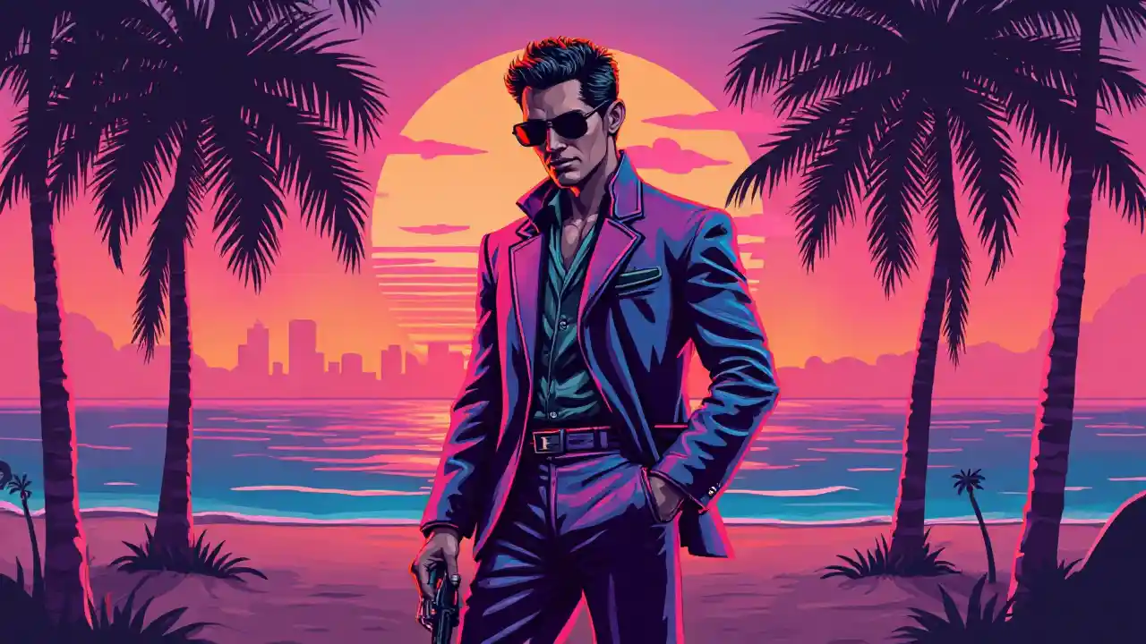 Cartel de fiesta retro de los 80 con traje de vicio de Miami, colores vibrantes de neón, onda sintética, vibraciones disco, palmeras y puestas de sol