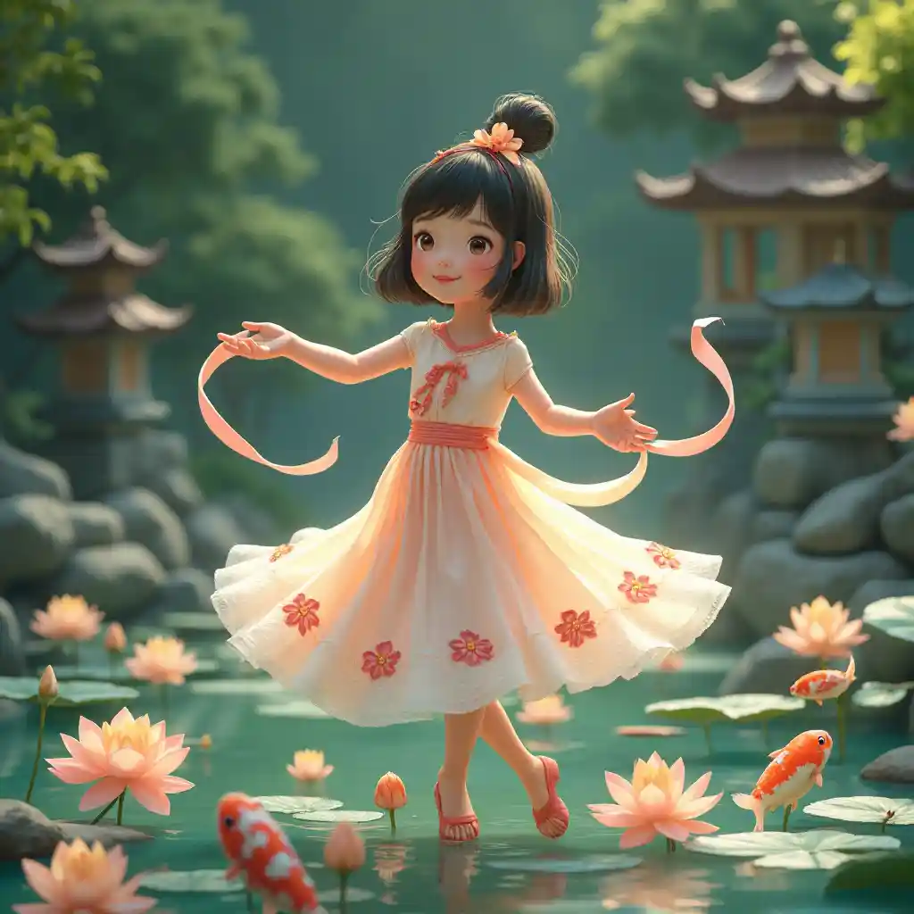 Bailando con una cinta en un estanque de lotos, una niña asiática de 7 años con corte de pelo bob lleva un vestido con bordados de pétalos. Los peces Koi y las linternas de piedra la enmarcan, sus elegantes giros irradian elegancia y encanto lúdico en un entorno tranquilo y tradicional.