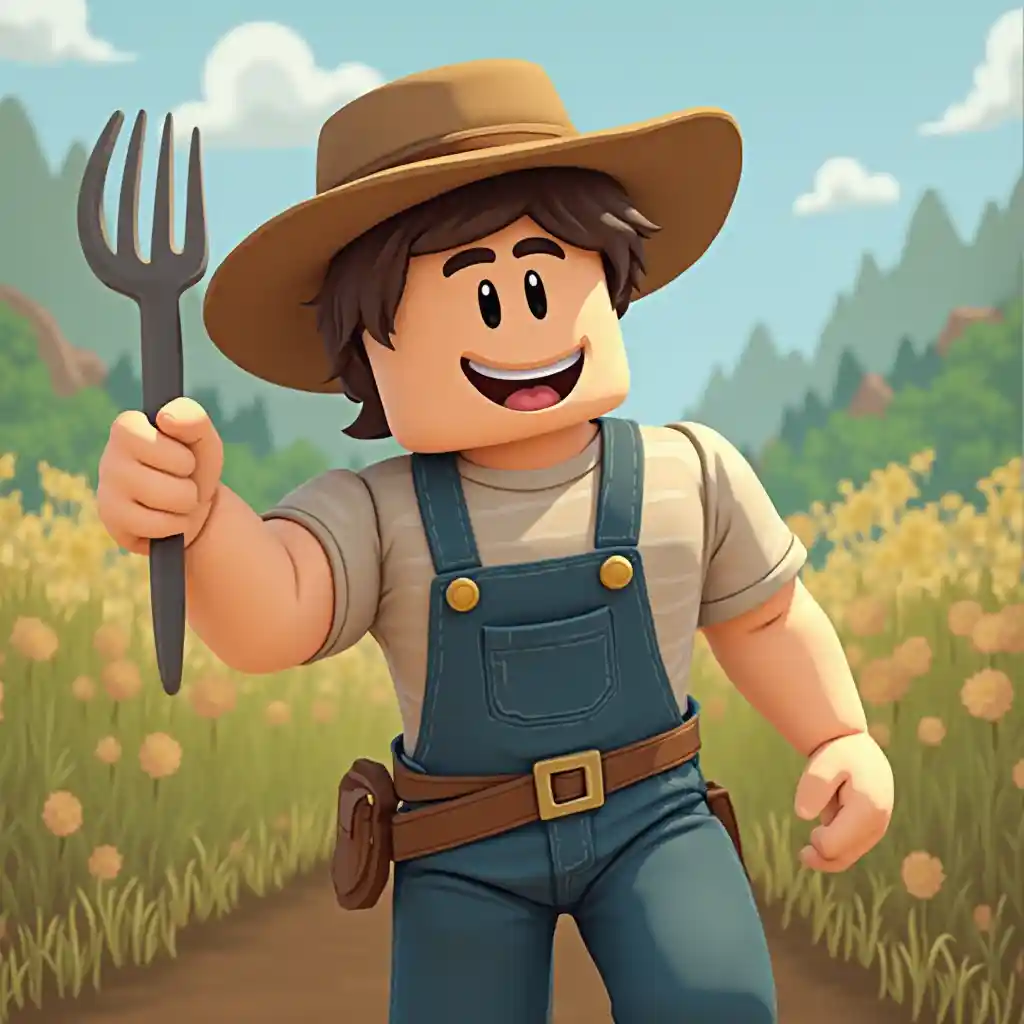BenjaminHaga que un personaje de granjero roblox sostenga su tenedor de mano ligeramente mirando a la izquierda