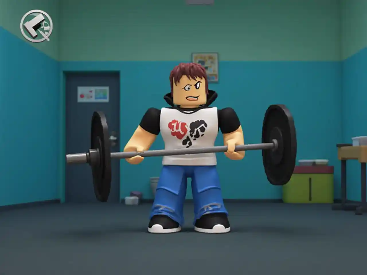 Personaje al estilo Roblox levantando una barra en un gimnasio con paredes azules y verdes.
