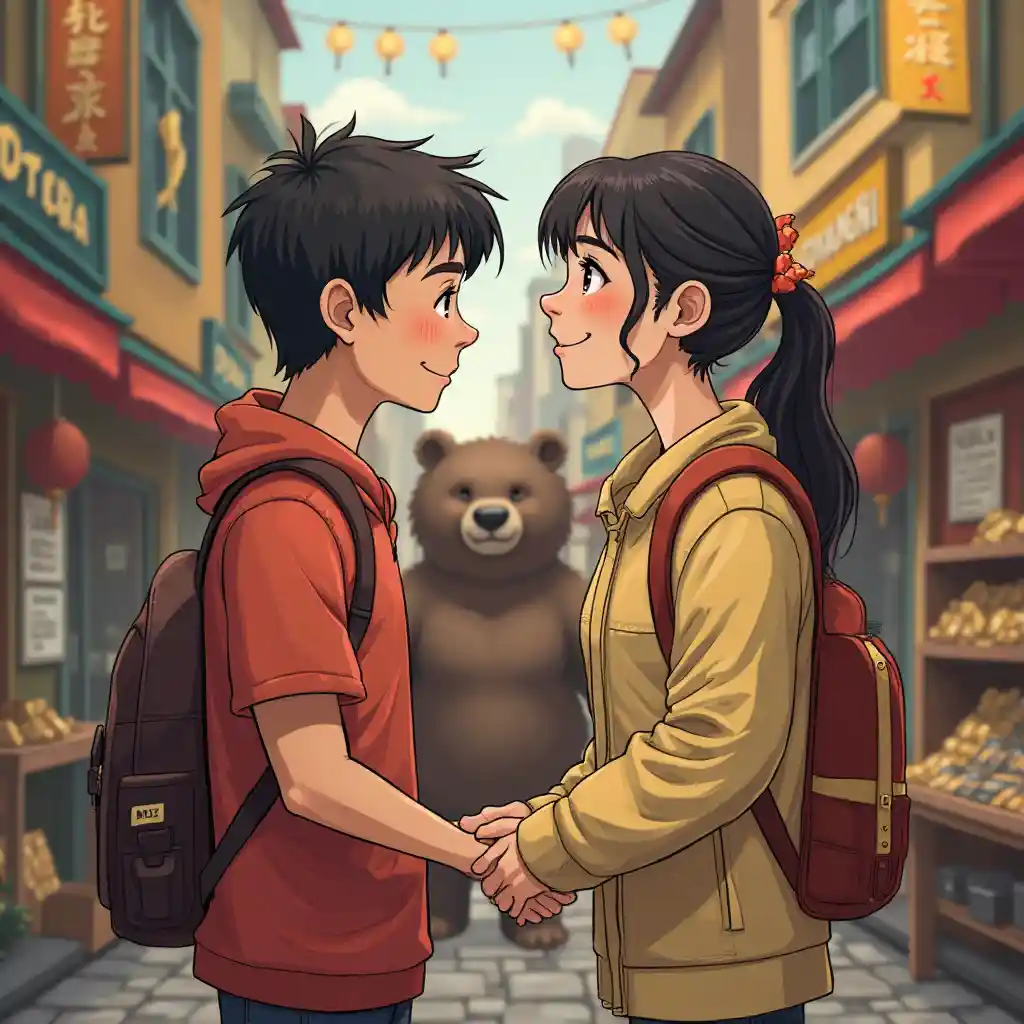 El chico John y la chica Sarah entablan una relación romántica. Su amigo Satoshi, un alegre hombre chino, está de pie junto a ellos. En el fondo hay un mercado de negociación de memes de osos y tokens.