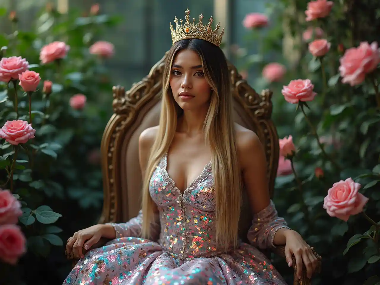 Fotografía de una hermosa reina femenina que se parece a Lalisa Manoban sentada en un trono en un rincón de un jardín de rosas en una fresca selva tropical, detalle de su hermosa cara regordeta con maquillaje perfecto, usando un hermoso vestido holográfico de lentejuelas con patrones florales, cabello rubio oscuro recto con ombré, usando una corona, detalle corporal perfectamente proporcionado, iluminación perfecta, anatomía perfecta, fotorrealismo, hiper-detalle, hiperrealismo, obra maestra, resolución HD 8K y color de ojos gris azul