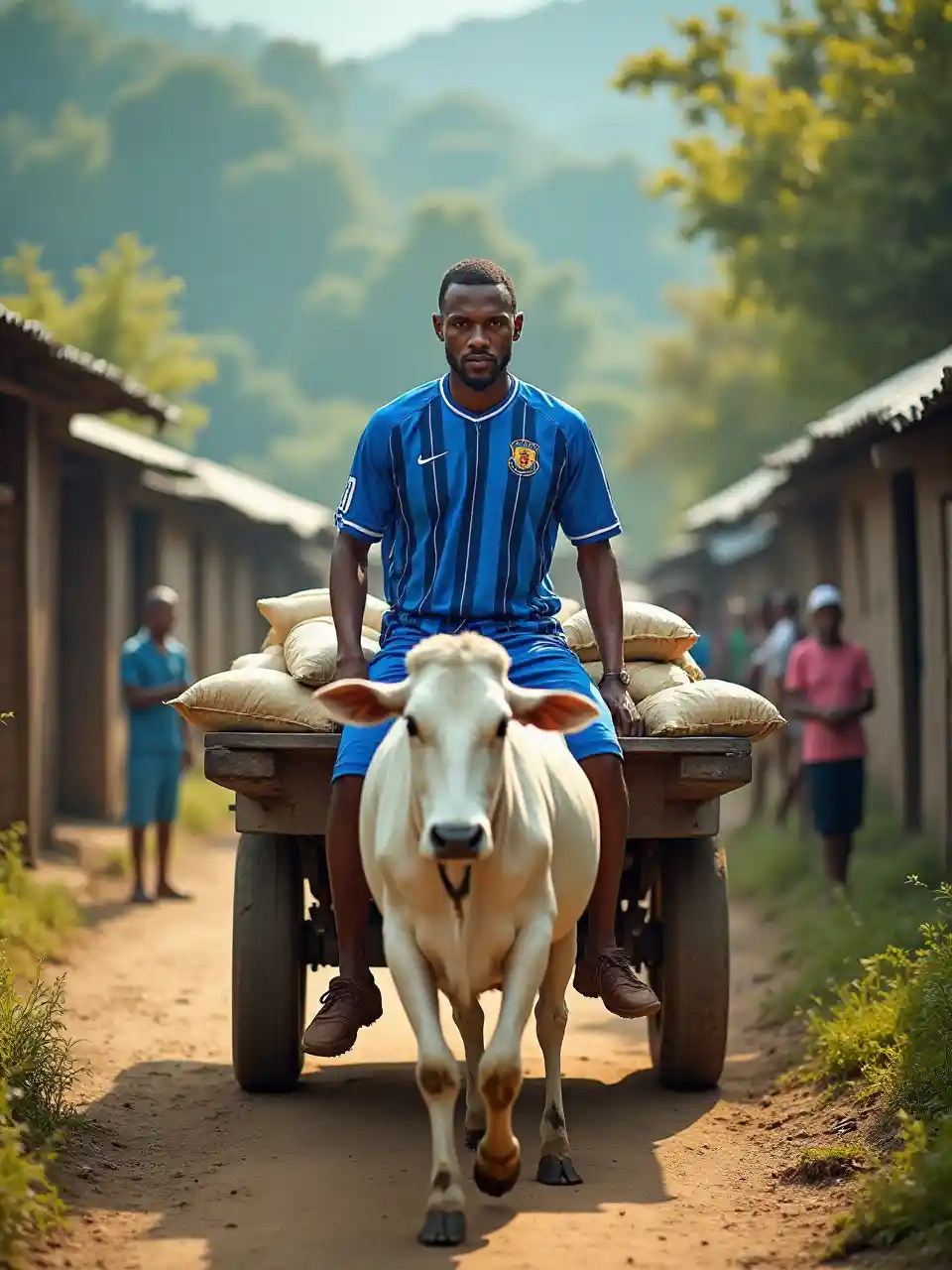 Una figura decidida, vestida con una camiseta de fútbol azul brillante adornada con rayas y detalles emblemáticos, guía un carro tirado por una robusta vaca blanca a lo largo de un camino de tierra rural. El hombre, luciendo una expresión enfocada, se sienta con confianza encima del carro, que está cargado con sacos beige que insinúan productos agrícolas, lo que sugiere una conexión con la comunidad agrícola local. A su alrededor, las rústicas estructuras de madera y un telón de fondo de exuberantes colinas verdes crean una atmósfera serena pero laboriosa, mientras que la suave luz del sol se filtra a través de los árboles, proyectando un cálido resplandor sobre la escena. La composición captura una mezcla de la vida agrícola tradicional con un toque moderno, evocando un sentido de integración cultural y el trabajo cotidiano de la vida rural, mientras los espectadores observan tranquilamente desde los lados.