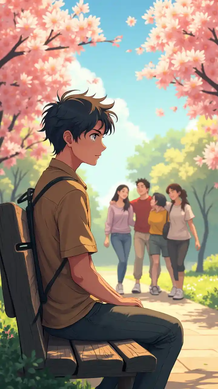 Un joven rural, de 18 años, con el pelo oscuro alborotado y expresión contemplativa, sentado solo en un banco de madera desgastado, su ropa rústica suavemente agitada por una brisa ligera, rodeado de una vibrante y animada escena del parque, un grupo de amigos alegres con coloridos atuendos riendo alegremente en el fondo, sus sonrisas radiantes mientras comparten un momento de camaradería, contrastando con la mirada ligera y triste del joven dirigida hacia ellos, estilo de arte anime con colores brillantes y vivos que realzan el contraste emocional, fondos pastel suaves y detalles de carácter vibrantes, el escenario captura un día soleado con rayos dorados que se filtran a través de los árboles lanzando patrones lúdicos en el suelo, la composición se centra en el perfil del joven para enfatizar su soledad, mientras que la risa del grupo crea un telón de fondo de felicidad, toques atmosféricos de flores de sakura que se arremolinan en la brisa, destacando la transición estacional, creando un estado de ánimo agridulce que encapsula tanto la alegría de la juventud como la punzada del aislamiento, diseñado en una técnica de anime dinámica que utiliza contornos nítidos y paletas de colores expresivos para crear profundidad y movimiento, expresiones faciales altamente detalladas que muestran la yuxtaposición de emociones