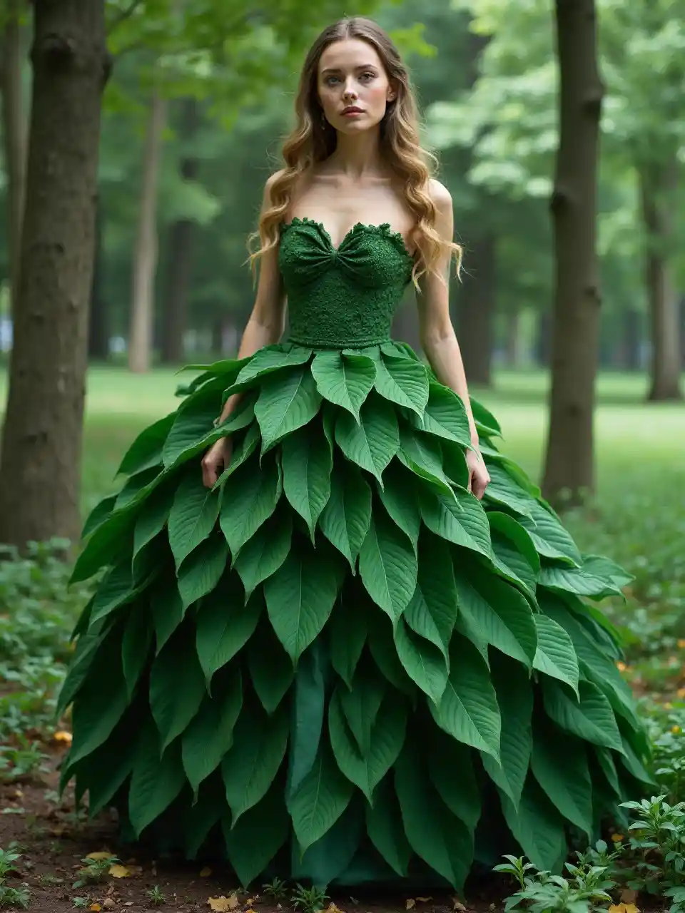 Maverickhermosa chica rusa de cuerpo entero con un enorme vestido hecho de hojas verdes
