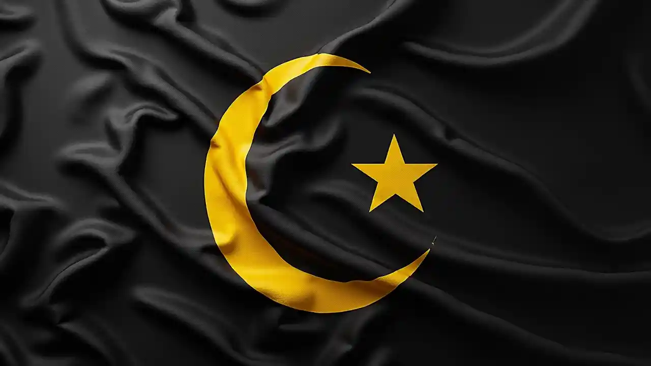media luna amarilla la bandera es negra y detrás de ella está la inscripción Imperio Salim