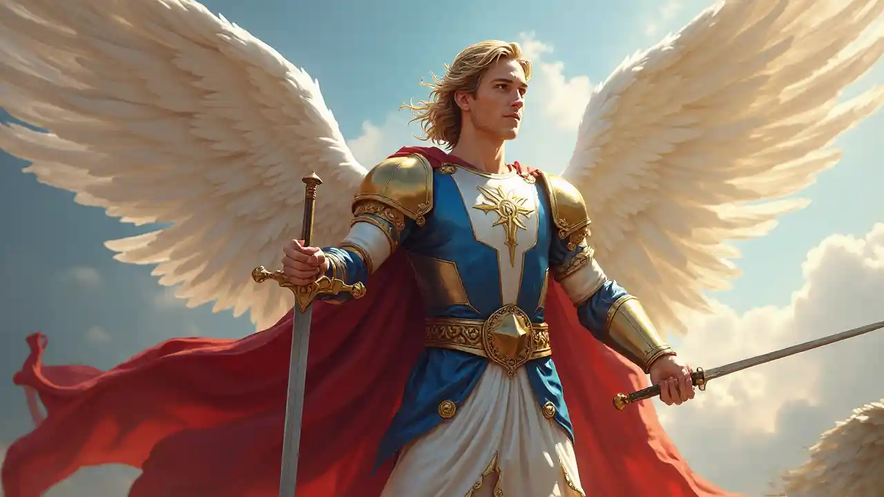 JamesSAN MIGUEL ARCANGEL, hombre de hermosas alas blancas, guerrero de la luz con espada y armadura azul, blanca y dorada y capa roja