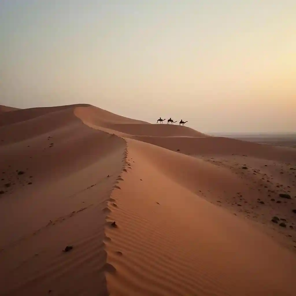 LucasRodando dunas de arena, con la silueta de una caravana solitaria de camellos al atardecer.