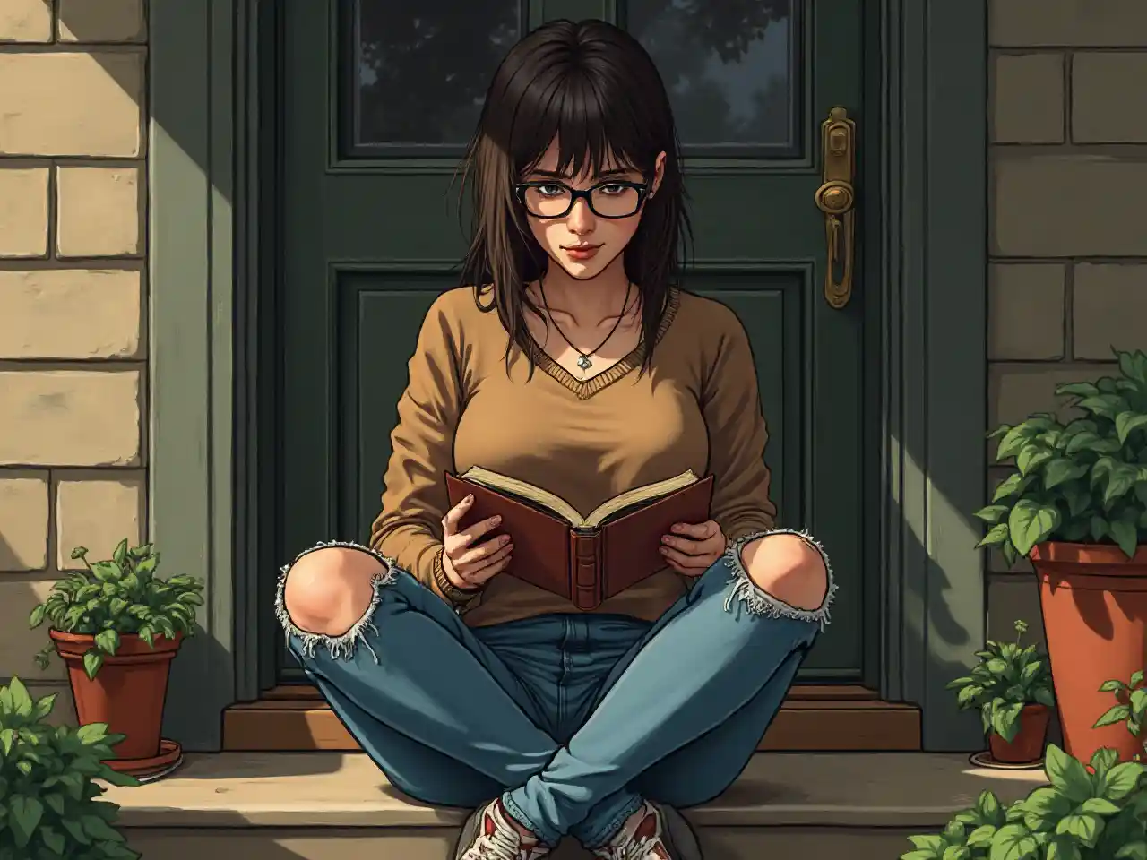 ((((Russ Mills y Casey Baugh estilo de arte de anime))) A ((((mujer de anime impresionantemente hermosa llamada Sarah con anteojos))), vestida con (((suéter marrón y jeans rotos))), sentada en el porche delantero leyendo su libro