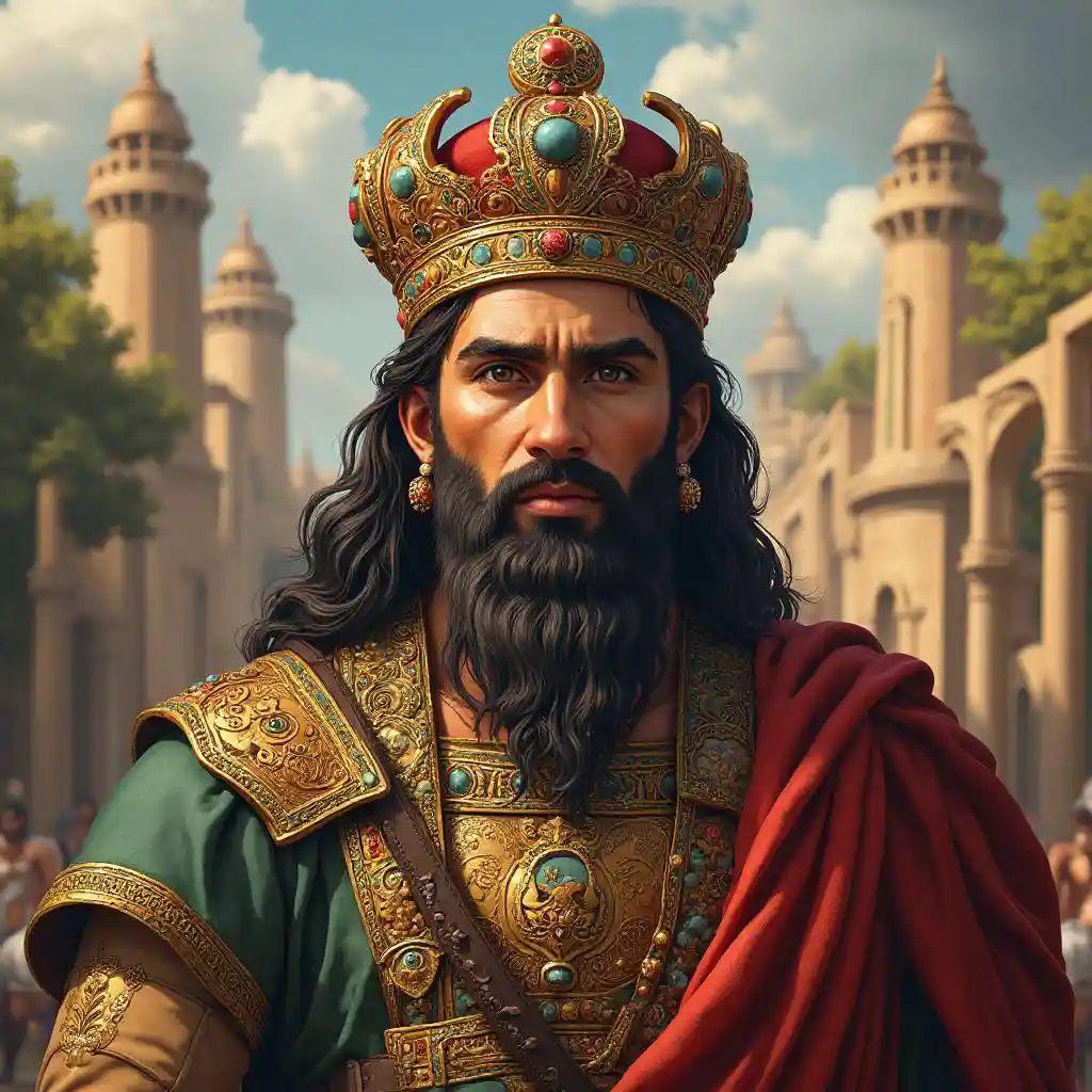 Crea un retrato detallado y majestuoso de un rey sasánida de la antigua Persia. Se debe representar al rey con atuendos reales tradicionales, incluida una corona adornada con joyas y patrones intrincados. El fondo debe reflejar la grandeza del Imperio sasánida, con elementos como grandes palacios, arquitectura persa antigua y exuberantes jardines. El estilo general debe ser realista e históricamente preciso, capturando la esencia regia y poderosa de la dinastía sasánida.