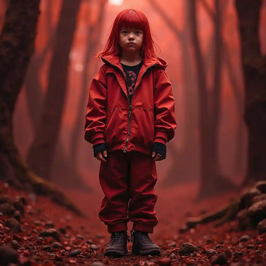 Una joven y hermosa chica con una chaqueta y pantalones HOODY futuristas y cabello rojo contra el telón de fondo de un bosque espacial alienígena en tonos rojo-borgoña, fondo borroso, enfoque en la niña, tela detallada, Iluminación dramática, Profundidad de campo, Increíblemente alto detallado los zapatos son de baba oscura, veneno, ciencia ficción, alienígena, atmósfera profunda, oscuridad, saturación, vibración, colores brillantes y saturados, elegantes, altamente detallados, moda, revista de moda,