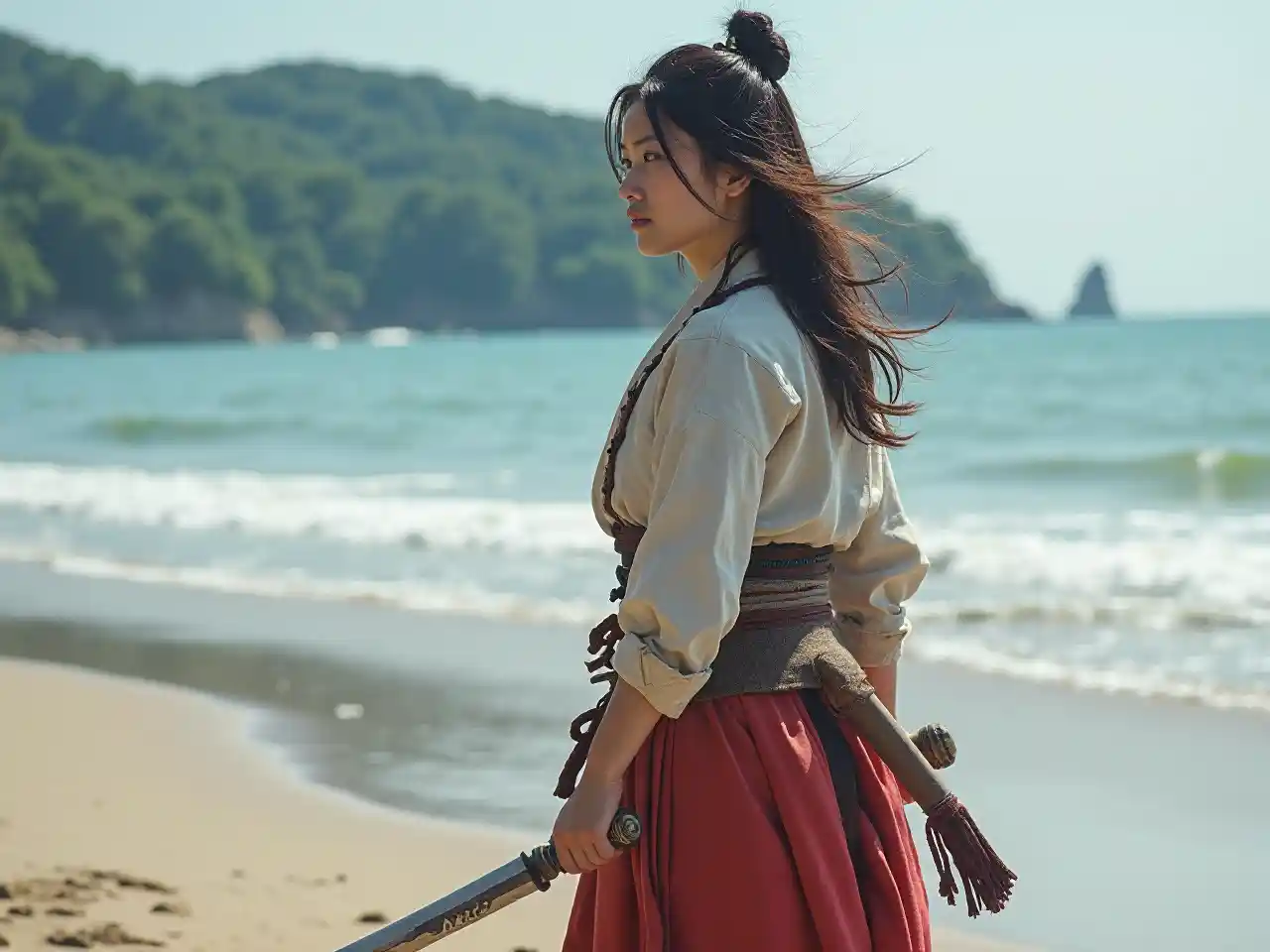 BrynnPaisaje costero con una mujer guerrera Kunoichi de 20 años en la playa de la costa japonesa.
