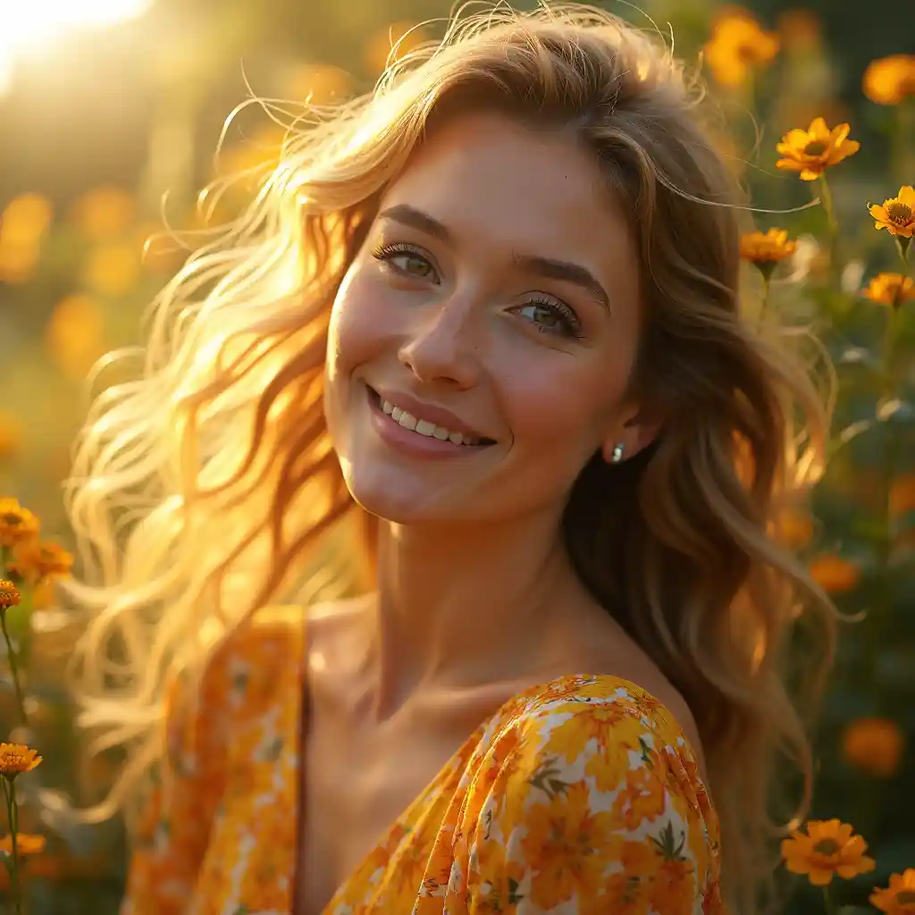 (Four Seasons Woman) una mujer hermosa para cada temporada, con una cara distintivamente hermosa que encarna la esencia de la temporada. Ella emana los tonos cálidos y acogedores del verano, con sus rayos soleados besando su rostro, dándole una sensación de renovación y crecimiento. Su cabello, una cascada de tonos dorados, es una metáfora del exuberante y abundante paisaje que la rodea. La escena es una mezcla perfecta de colores cálidos y sombras suaves, evocando la sensación de un día de verano sereno y acogedor.