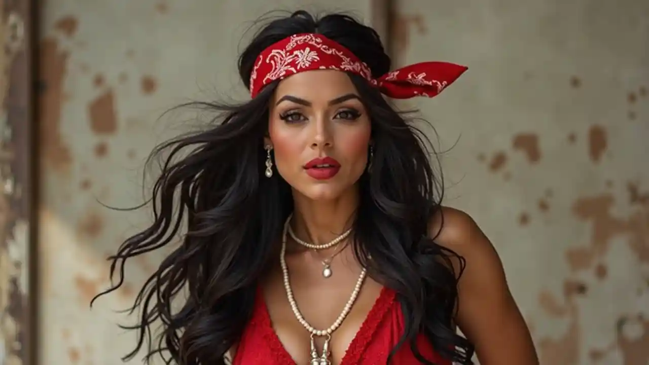 "Selena Quintanilla, la reina del tejano. Su cabello largo y oscuro cae en cascada por su espalda mientras mece un labio rojo audaz y un pañuelo atado alrededor de su cabeza. Ella emana confianza mientras se pavonea con su pequeña pero curvilínea figura capturando su esencia en la moda de hoy.