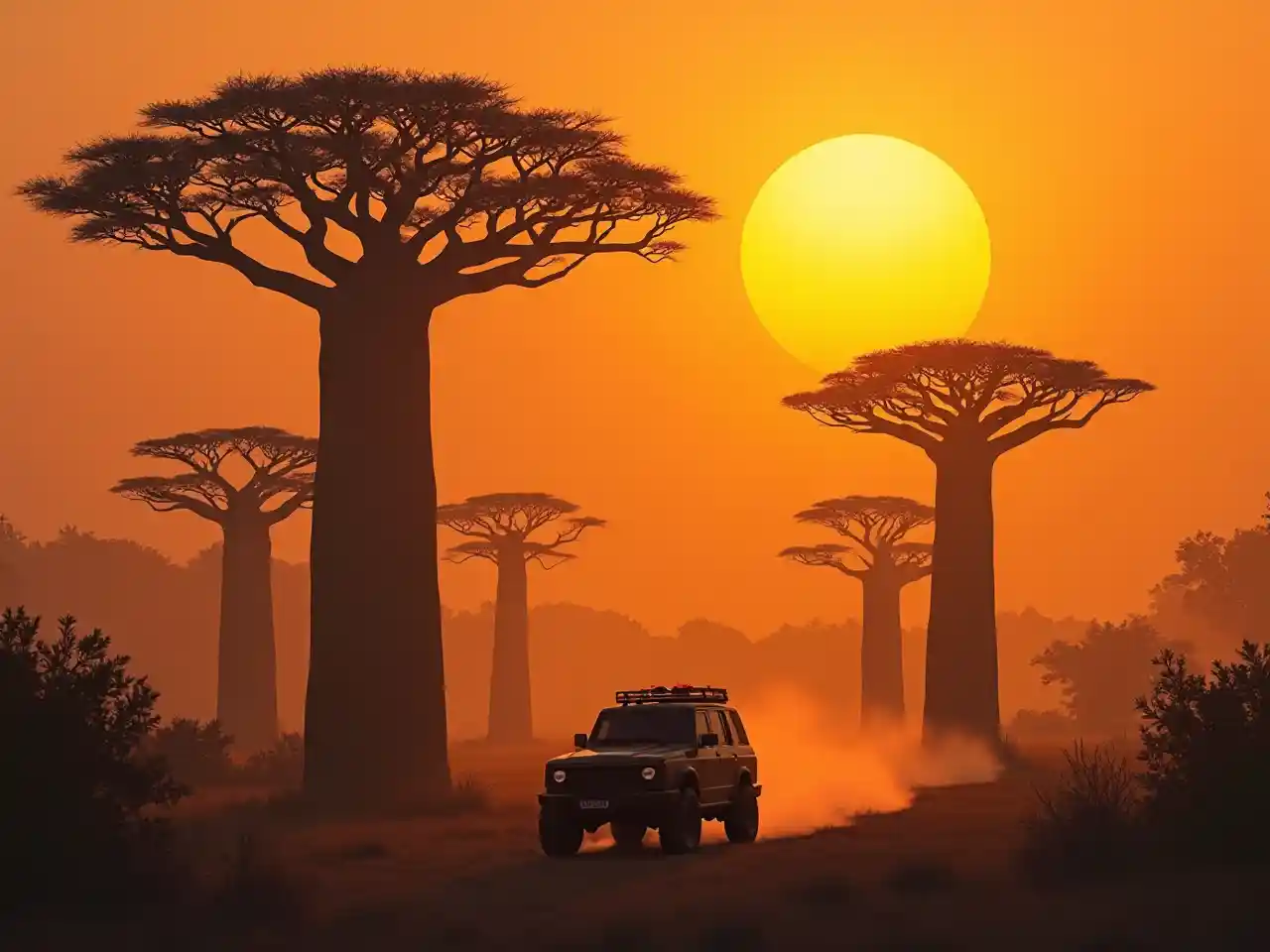 La imagen muestra un paisaje sereno con un gran sol poniente en el cielo, inundando la escena con un cálido resplandor naranja. En primer plano hay varios árboles altos de una forma única con coronas extendidas, probablemente baobabs, que se destacan sobre el fondo de un área forestal cubierta de niebla. Los árboles se siluetean contra el cielo brillante, creando un sorprendente contraste entre los contornos oscuros y los tonos naranjas brillantes. Entre los árboles va el pan UAZ-loaf levantando polvo detrás de sí mismo. El ambiente general es tranquilo y pintoresco, evocando una sensación de belleza natural y paz.